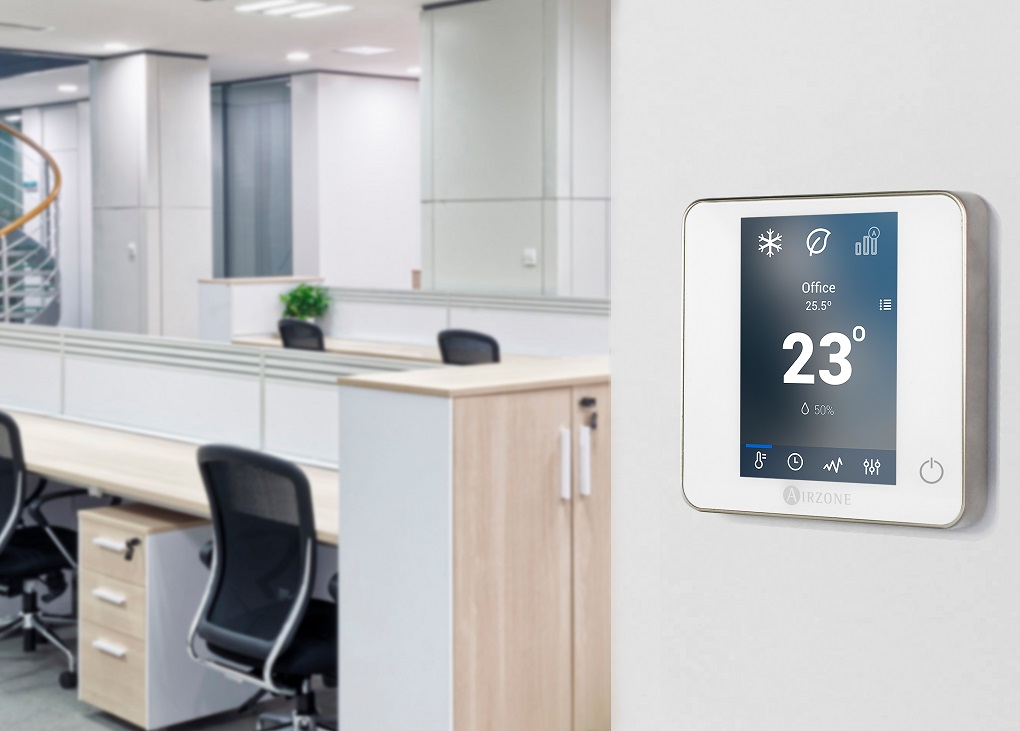 Interfaccia grafica a colori con schermo capacitivo e finitura in acciaio e vetro per il controllo di zona in un sistema Airzone, comunicazione tramite cavo. Alimentato tramite la scheda centtrale del sistema