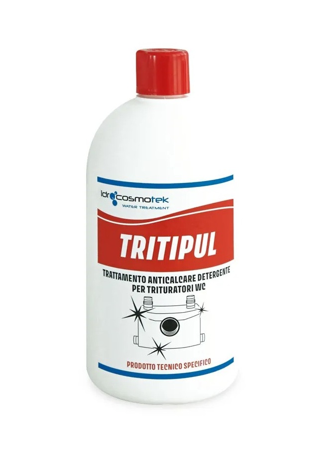 TRITIPUL è un detergente anticalcare studiato per il trattamento di manutenzione periodica dei trituratori per WC integrati oppure esterni. Appositamente formulato per rispettare tutti i componenti degli apparecchi e garantirne la massima efficienza e durata nel tempo. Rimuove calcare, sedimenti e incrostazioni mantenendo tutto l’impianto perfettamente pulito.