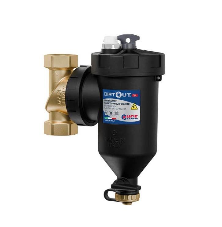 Defangatore magnetico orientabile multifunzione, adatto per impianti a caldaia murale con vano tecnico e impianti di condizionamento. Grazie alla separazione ciclonica e magnetica a monte del filtro viene minimizzato il problema dell’intasamento. La cartuccia filtrante, separata dallo sporco catturato, mantiene la sua migliore efficienza nel tempo.