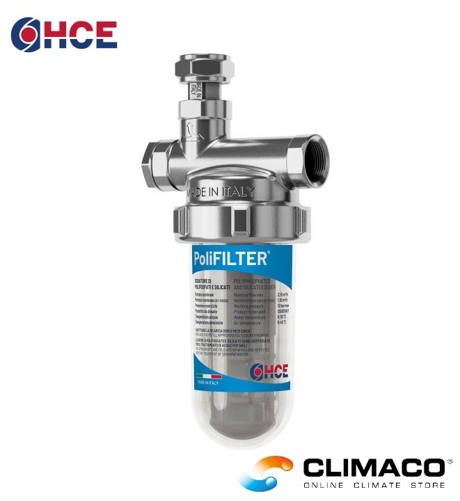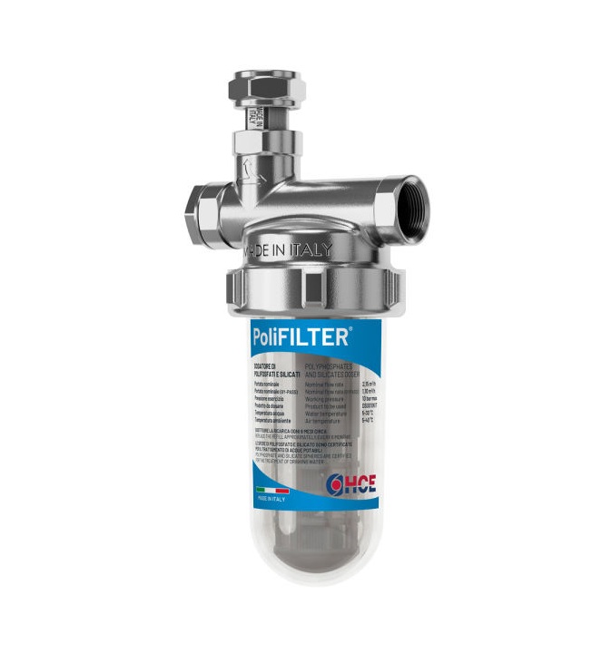 PoliFILTER® è un dispositivo senza organi in movimento che tramite il consumo calibrato delle sfere contenute nella cartuccia, effettua un dosaggio di polifosfati e silicati alimentari nell’acqua fredda sanitaria. PoliFILTER® può essere installato a protezione di caldaie, scaldabagno, lavastoviglie e lavatrici. Per PoliFILTER® è necessaria l’installazione di due valvole a sfera prima e dopo il componente che permettono di isolarlo dall’impianto e quindi di effettuare l’operazione di sostituzione della cartuccia una volta esaurita. Per evitare l’interruzione della fornitura di acqua potabile va previsto nell’impianto un ramo di bypass. Utilizzare solo ricarica originale (cod. DS0010KIT).