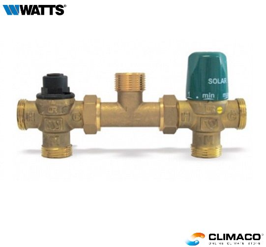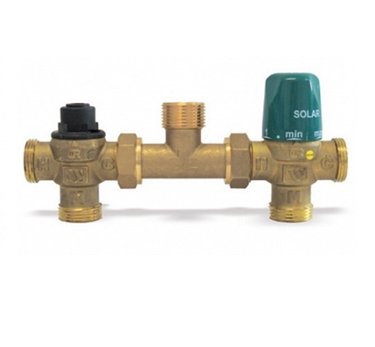 Gruppo termostatico di integrazione termica tra impianto solare e caldaia composto da valvola miscelatrice Serie MMV-S, raccordo a Tee, valvola deviatrice. Corpo in ottone antidezincificante DZR CW602N.