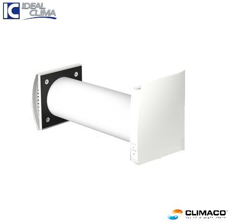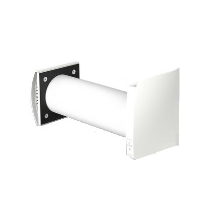 Unità di recupero puntuale di calore, da inserire in pareti perimetrali, con scambiatore in ceramica a celle esagonali ad altissimo rendimento, in grado di trattare una portata massima di 50 mc/h di aria alternativamente in immissione ed in estrazione, per un volume interno servibile fino a 50 m3. Dotata di chiusura automatica ermetica al vento come richiesto dalla Normativa CE13141-8, funzione notte (attenuazione rumore notturno) e funzione umidità. Pressione sonora a 3 m inferiore a 29 dB secondo UNI EN ISO 3746:1997, attenuazione acustica dei rumori esterni di 42 dB, motore EC a risparmio energetico, consumo elettrico inferiore a 4,97 W. Telecomando a corredo.